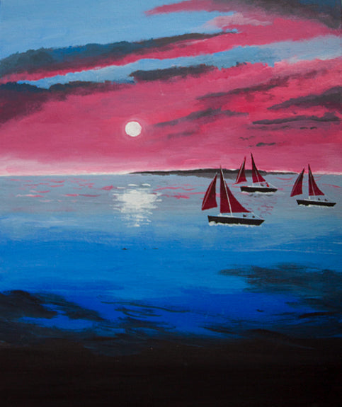 This is the second painting of a series of abstract ‘Moonlight’ paintings where I have combined my imagination with photos I took in the evening overlooking Weston-super-Mare. I was envisaging a fleet of work boats sailing home throuigh Bristol Channel.